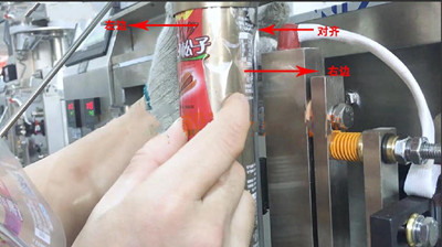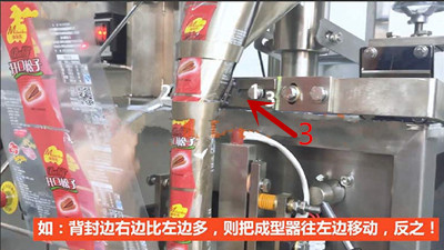 1)包裝膜安裝好后,開(kāi)機(jī)測(cè)試,包裝膜制袋后,出現(xiàn)如下圖包裝袋背面封口左邊袋子邊比右邊袋子邊短小的情況。接下來(lái)根據(jù)包裝膜拉膜跑偏的情況調(diào)節(jié)包裝機(jī)的成型器。