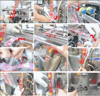 5、注意,如果立式顆粒包裝機(jī)安裝了光電眼的話,包裝膜需要經(jīng)過光電眼固定位置,如圖標(biāo)示7的位置,把包裝膜卡在不銹鋼板上;