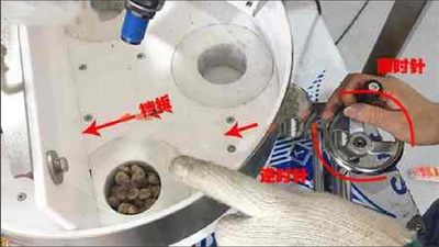 顆粒包裝機(jī)量杯計(jì)量裝置上的手柄往順時(shí)針?lè)较蚺?dòng),扭動(dòng)至物料與萬(wàn)能量杯平齊,如果52g珍珠丸子低于萬(wàn)能量杯,那么把量杯計(jì)量裝置上的手柄往逆時(shí)針?lè)较蚺?dòng)。調(diào)節(jié)好后,量杯計(jì)量裝置在旋轉(zhuǎn)的時(shí)候物料經(jīng)過(guò)擋板的時(shí)候,沒(méi)有卡料就證明調(diào)節(jié)好了。如下圖